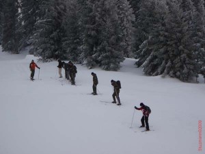 Und so fuhren wir immer wieder an der ziemlich irritierten Bundeswehr-truppe vorbei, die heute augenscheinlich ihren ersten Schneetag hatte. Am Waldmeister traffen wir kurzzeitig Anselm, im Süden waren wir völlig alleine und auch die ersten. Leider musste Mario schon wieder in die Küche. Dafür rammte Dejan einen Baum, der partout nicht nachgeben wollte. Danach schmerzte seine Wade und sein Gestöhne lockte sicher den ein oder anderen Hirsch aus dem Unterholz.