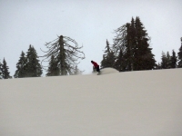 Der fiel aber doch nicht so stark wie erwartet aus. Wahrscheinlich wurde er einfach vom stürmischen Wind verblasen. Stellenweise hatten wir richtig gute Powderabfahrten, fuhren aber auch über Eisplatten. Letztendlich hatten Andreas und ich einige gute Powderturns. In mein Brett haben sich aber leider schon die ersten Gesteinsablagerungen im Belag festgesetzt. Das kommt davon, wenn man mit dem neuen Brett abseits geht. Gewisse Dinge ändern sich einfach nie.