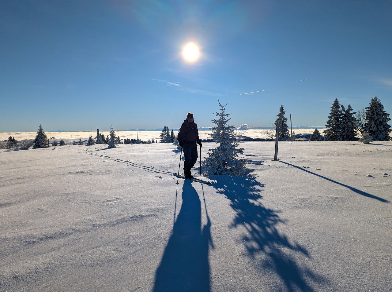 Heute ging das erste Türchen des Adventskalenders auf. Und welche Geschenke kommen in der weihnachtlichen Zeit besonders gut an? Natürlich, Kosmetikprodukte. Der Inhalt hinter dem ersten Türchen des Feldberger Adventskalenders war dann auch gleich was zum Aufhübschen. 3 Zentimeter Puder mit allerlei Glitzer drin. Und drumherum wurde ordentlich mit Wattebäuschen geworfen. Nachdem es gestern zum Teil noch Bindfäden geregnet hatte, fühlte es sich heute bei -6°C gleich wieder so richtig nach Winter an. Der 6er Sessel lief nicht, dafür liefen wir. Ausgiebig über den Feldberg, den Seebuck und genossen die ganz besondere Stimmung. Alles weiss mit dem tollen Glitzern der Schneekristalle, nur vereinzelten Menschen, kein Wind und die herrlich wärmende Sonne. Von mir aus könnte jedes Türchen solch tolle Tage bringen.