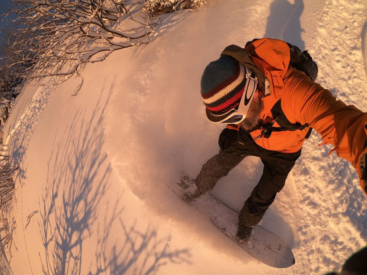 Um 7:56 Uhr standen wir mal wieder an unserem Lieblingsabfellbaum (nicht zu verwechseln mit dem Lieblingsapfelbaum), und der Moment wurde so kitschig, dass selbst die aufsteigenden Snowkiter vor lauter Entzückung kurze, spitze Schreie von sich gaben. Die Stimmung triefte wirklich vor Kitsch. Da wir aber, was Sonnenaufgänge angeht, schon etwas abgebrüht sind, dachte ich mir, die ekstatischen Schreie hebe ich mir für das Tiefschneeerlebnis auf.