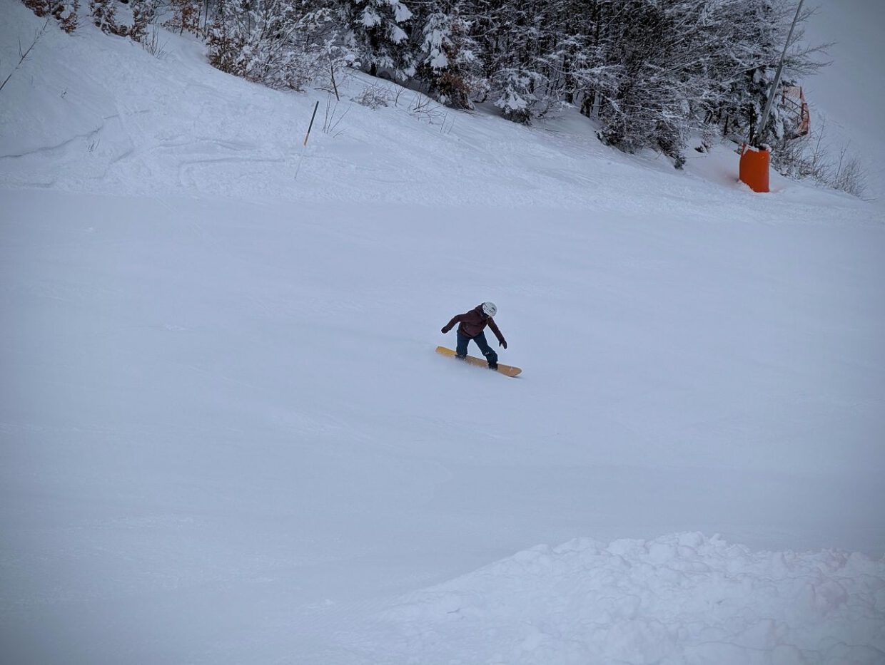 Leider behielt ich sie dann doch bei mir. Die ganzen arbeitslosen Freerider hatten ganze Arbeit geleistet und die lohnenswerten Abschnitte komplett zerbombt. Die FIS, griffig und wenig frequentiert, aber auch der Seebuck – zu Beginn noch sonnenbeschienen und etwas kniefreundlicher, sprich weicher – entlockten uns aber zumindest ein leises Jauchzen. Zumindest so lange, bis die Schneefront heranzog, den Himmel verdunkelte und ihre weiße Pracht ablegte.