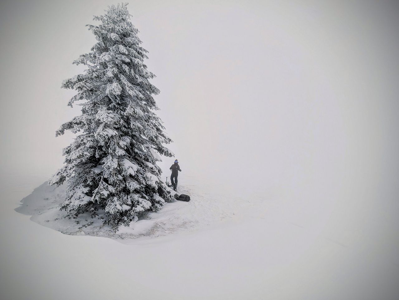 Der stürmische Wind trieb heute die Nebelschwaden über den Berg und ließ uns die Krägen hochschlagen und die Mützen tiefer ins Gesicht ziehen. Die Sicht war stark eingeschränkt, und wir waren froh, als wir in unserem zweiten Wohnzimmer ankamen – dem Windschatten des Lieblingsabfellbaums.