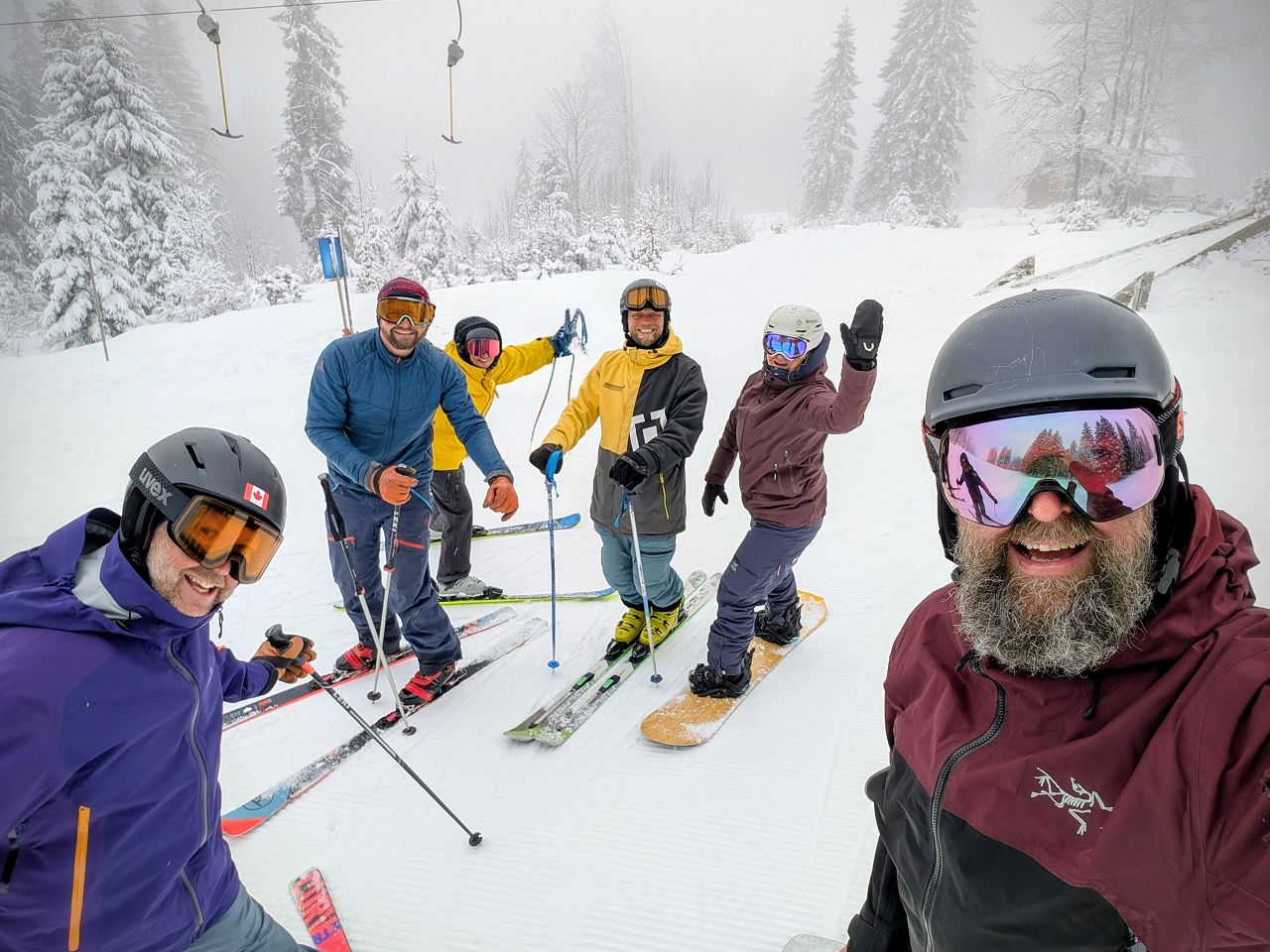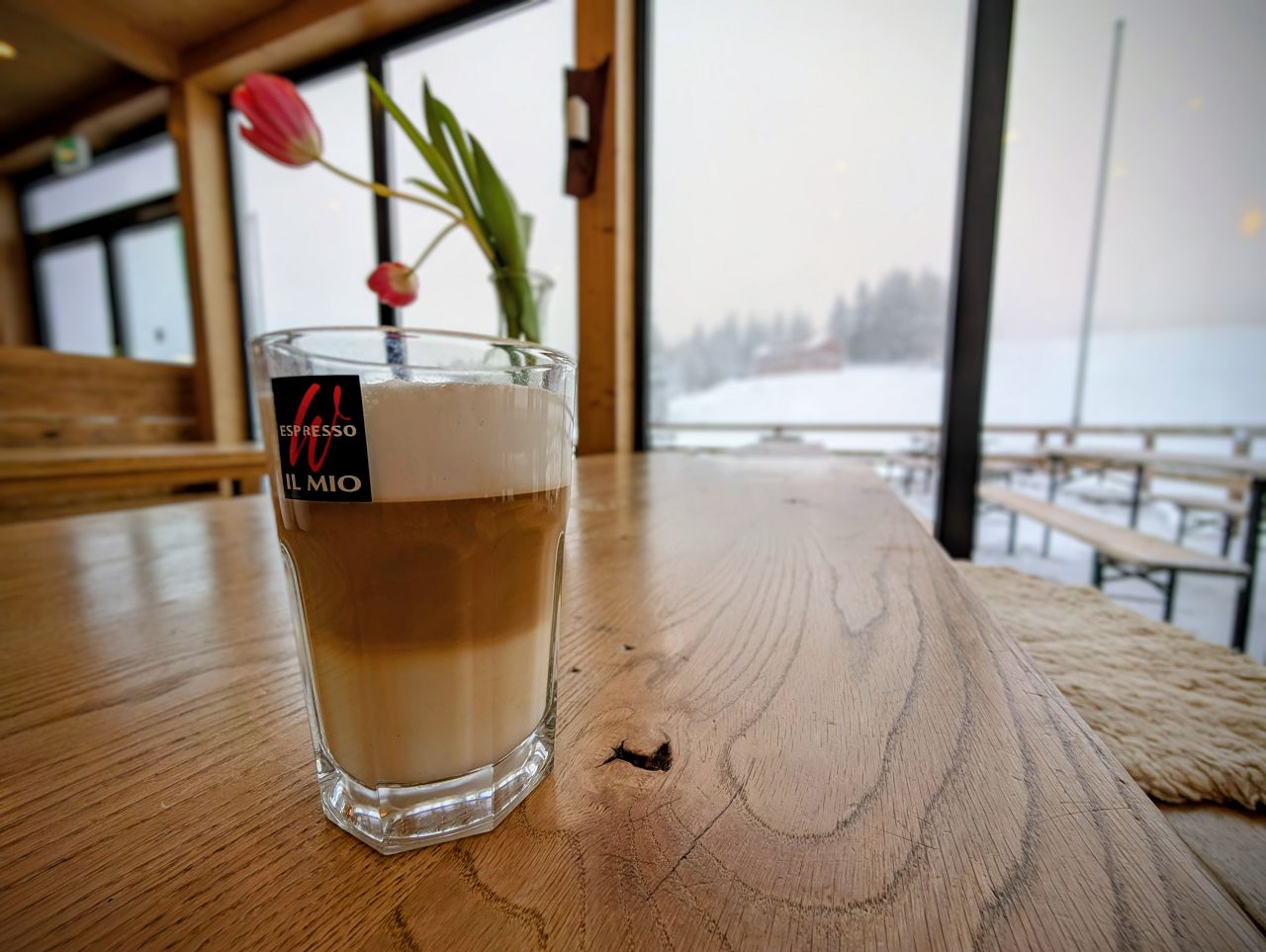 Nach der Aufwärmrunde war uns aufgrund des Wetters erst einmal nach einem heißen Getränk. Und das nahmen wir in illustrer Runde ganz chillig und entspannt im Südhang zu uns. Diese illustre Runde begleitete uns anschließend auch noch auf die Piste.